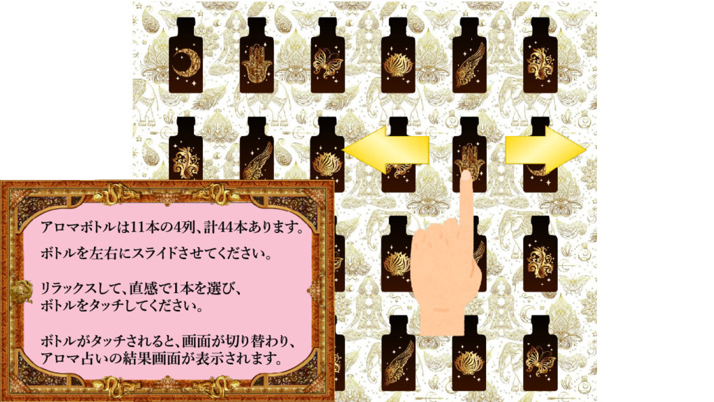 4.ボトルがタッチされると、画面が切り替わり、アロマ占いの結果画面が表示されます。