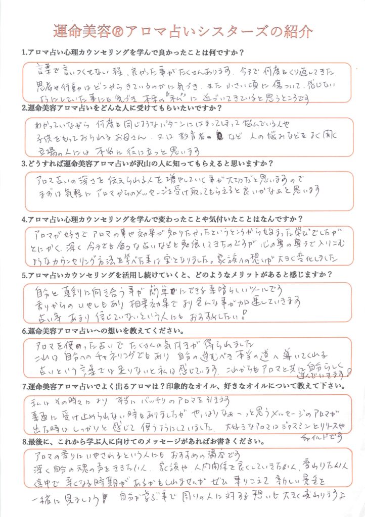 アロマが好きでアロマの事や効果が知りたかったということから始まった学びでしたがとにかく深く、今までも色々な占いなどを勉強してきたのですが心の奥底まで入り込むようなカウンセリング方法を学べたことは宝となりました。家族への想いが大きく変化しました。