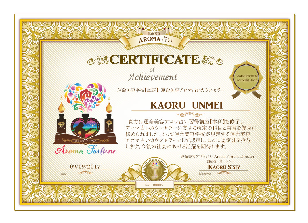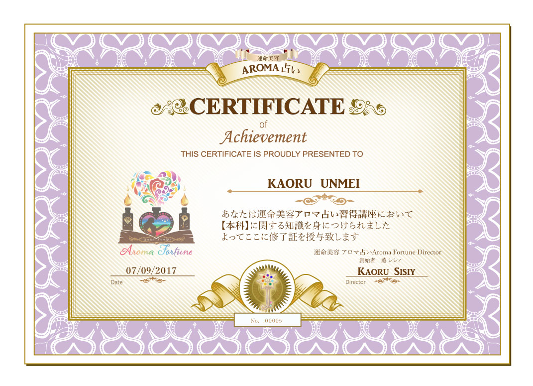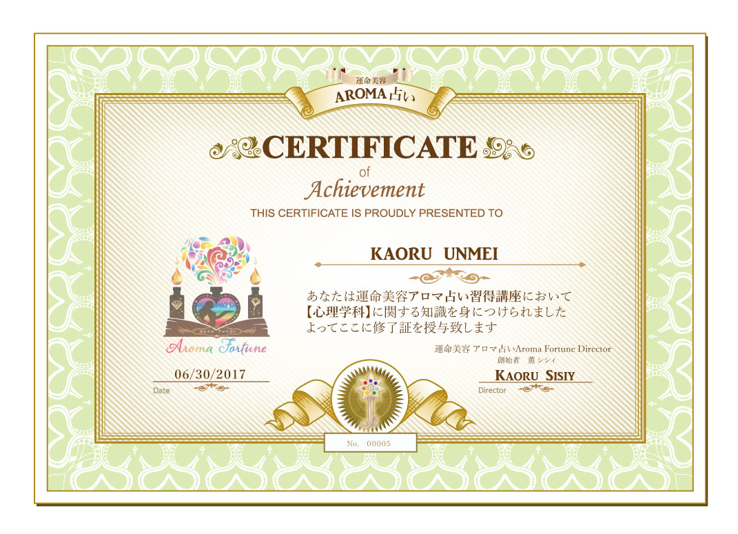 アロマ占い習得講座の基礎科・心理学科・本科のすべてを受講された方は修了書と認定ナンバーを授与します。