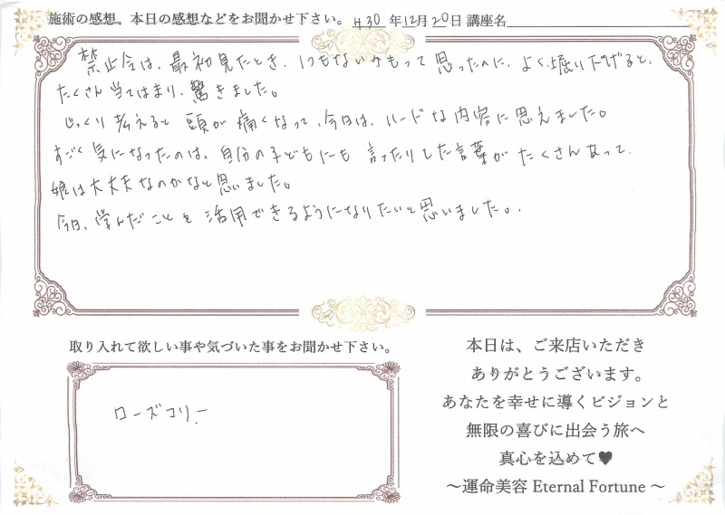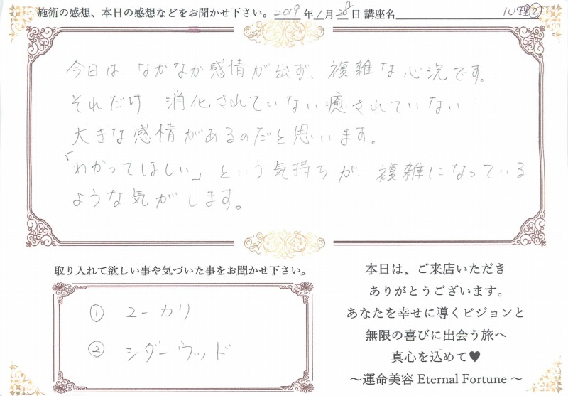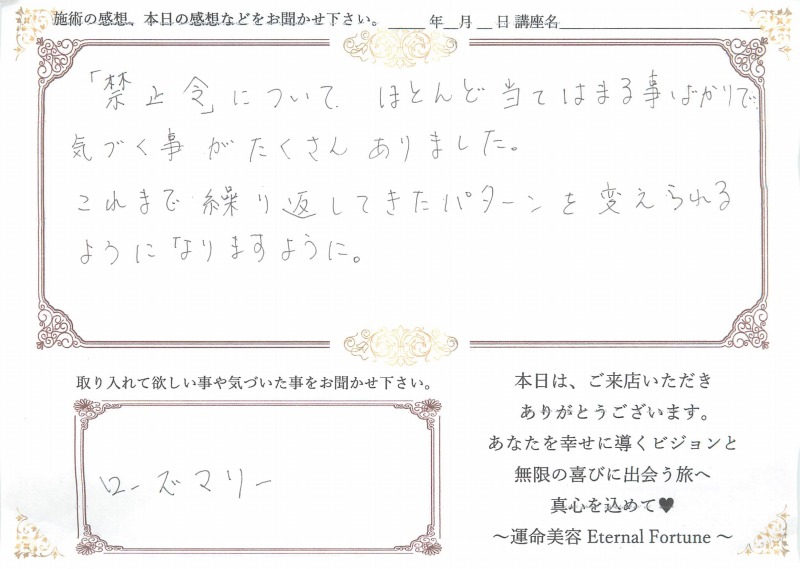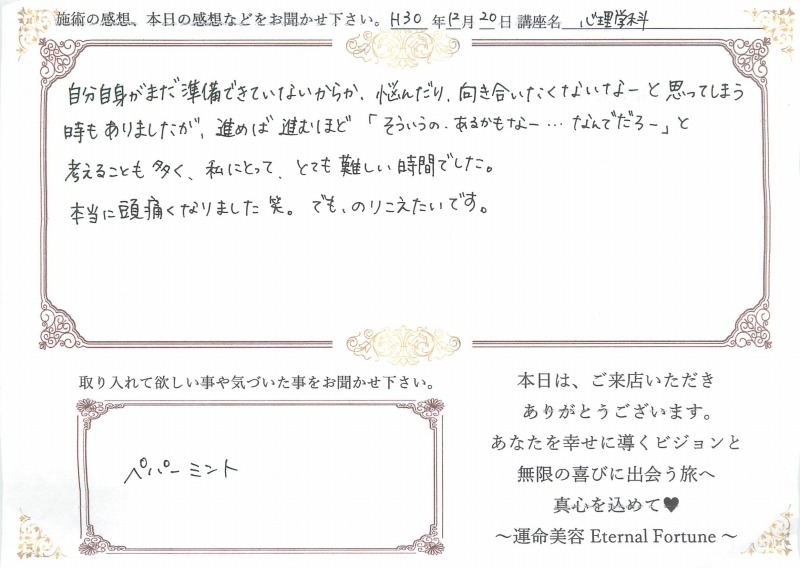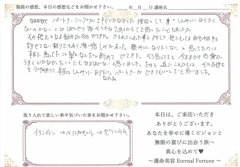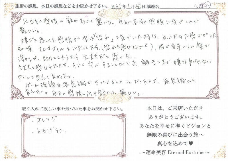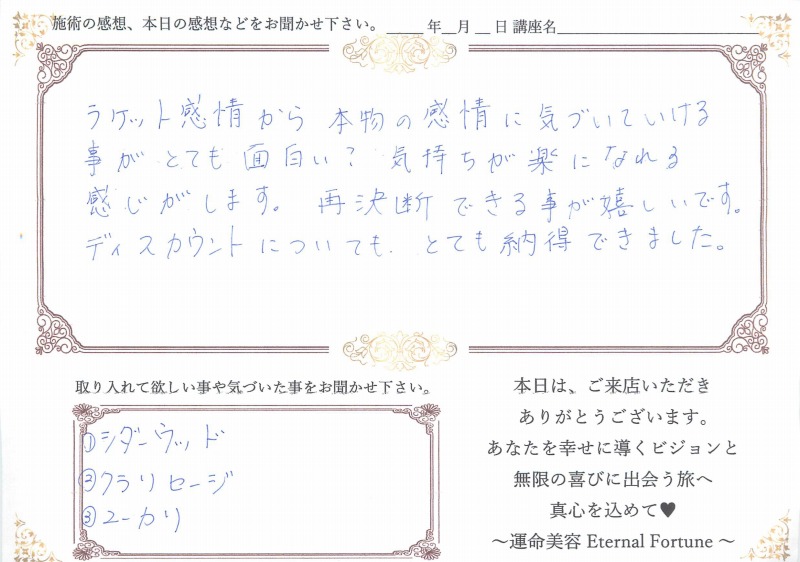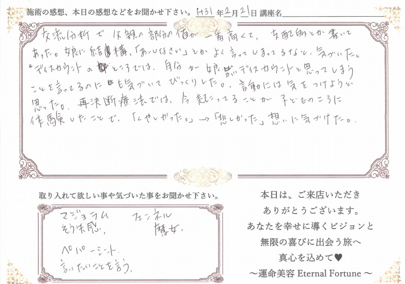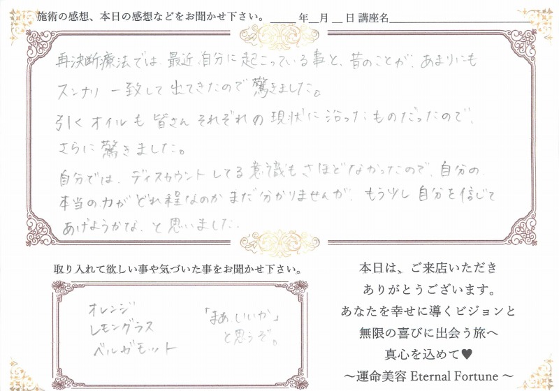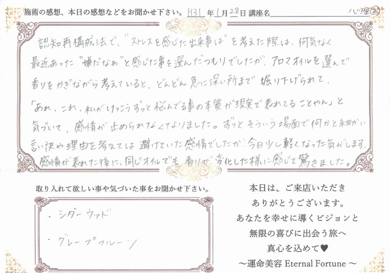 では、アロマ占い心理カウンセリング講座【第5期】の方の感想をご紹介していきます。