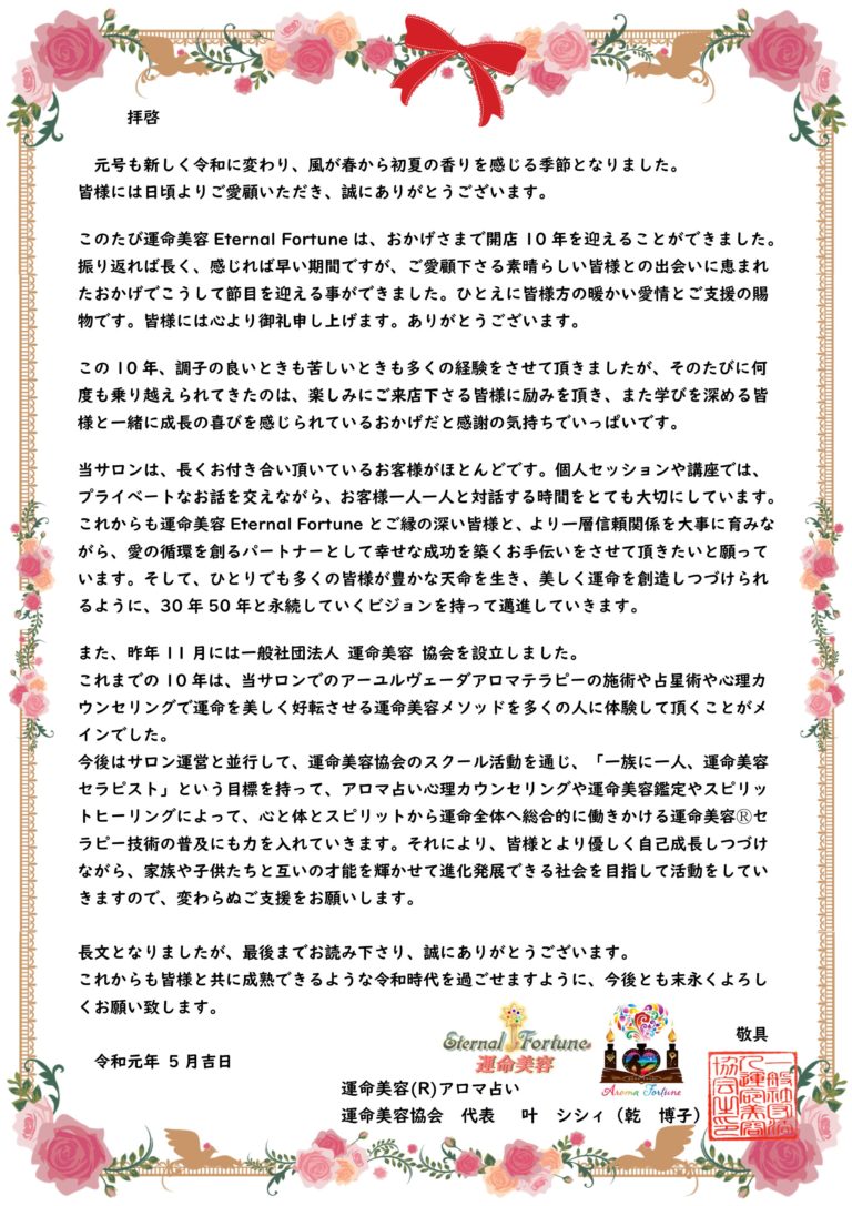 運命美容Eternal Fortune/運命美容学校はおかげさまで10周年を迎えられました。
