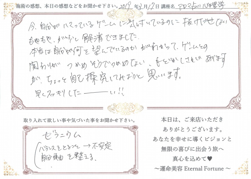 心理アロマ占い講座では、アロマテラピーと心理学を通じて、自分自身の内面を癒し、運命を美しくする方法を学びます。 例えば、以下のような悩みを持っている方に、特に効果的です: この講座では、自分自身の内側を癒し、未来に向けて前進する力を身につけることができます。あなたの人生を変える最初の一歩を踏み出してみませんか?詳しくは当HPからお申し込みください。 運命美容(R)心理学 アロマ占い心理カウンセリング習得講座で学ぶことが出来る内容について、詳細は下記のバナーをクリックして頂けると、受講内容についての詳細をご確認頂くことが出来ます。 【運命美容(R)心理学 アロマ占い習得講座の内容詳細について】 【運命美容(R)心理学 アロマ霊気ブレッシング講座の詳細】 コチラのページでは、頂いた感想やコメントなどをご紹介させて頂いております。基礎科だけでなく、心理学科や本科、ディプロマ認定を取得された方の感想も沢山紹介させて頂いております。 【運命美容(R)心理学 アロマ占い習得講座の感想】
